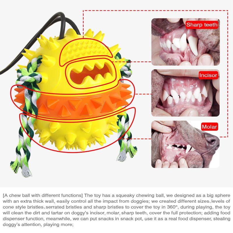 Vacuum suction cup pull rope ball, subvert the traditional suction cup pull rope ball by hand to squeeze the suction cup installation method, innovative design with vacuum suction pump third generation suction cup, suction cup side with suction button, repeatedly press the button several times to complete the installation, vertical tension can easily reach more than 130kg. On the other side of the suction cup is the deflation button, which makes it easy to deflate the suction cup with one button. The product rope is all made of 7 * 7 rubber wire rope, to eliminate the problem of being bitten off. The product motivates dogs to play. Multi-functional pet toys, a collection of pull tug-of-war function, squeaking sound function, leakage function, teeth grinding toy function, bounce function, teeth ball also comes with a dog bite cotton rope, multiple functions to bring multiple use experience to dogs